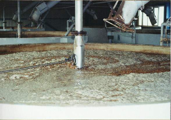 Nach einigen Tagen wird das Malz in Walzenmühlen gemahlen, der dabei entstehende „Grist“ wir mit heißem Wasser in der Maischetonne vermischt,